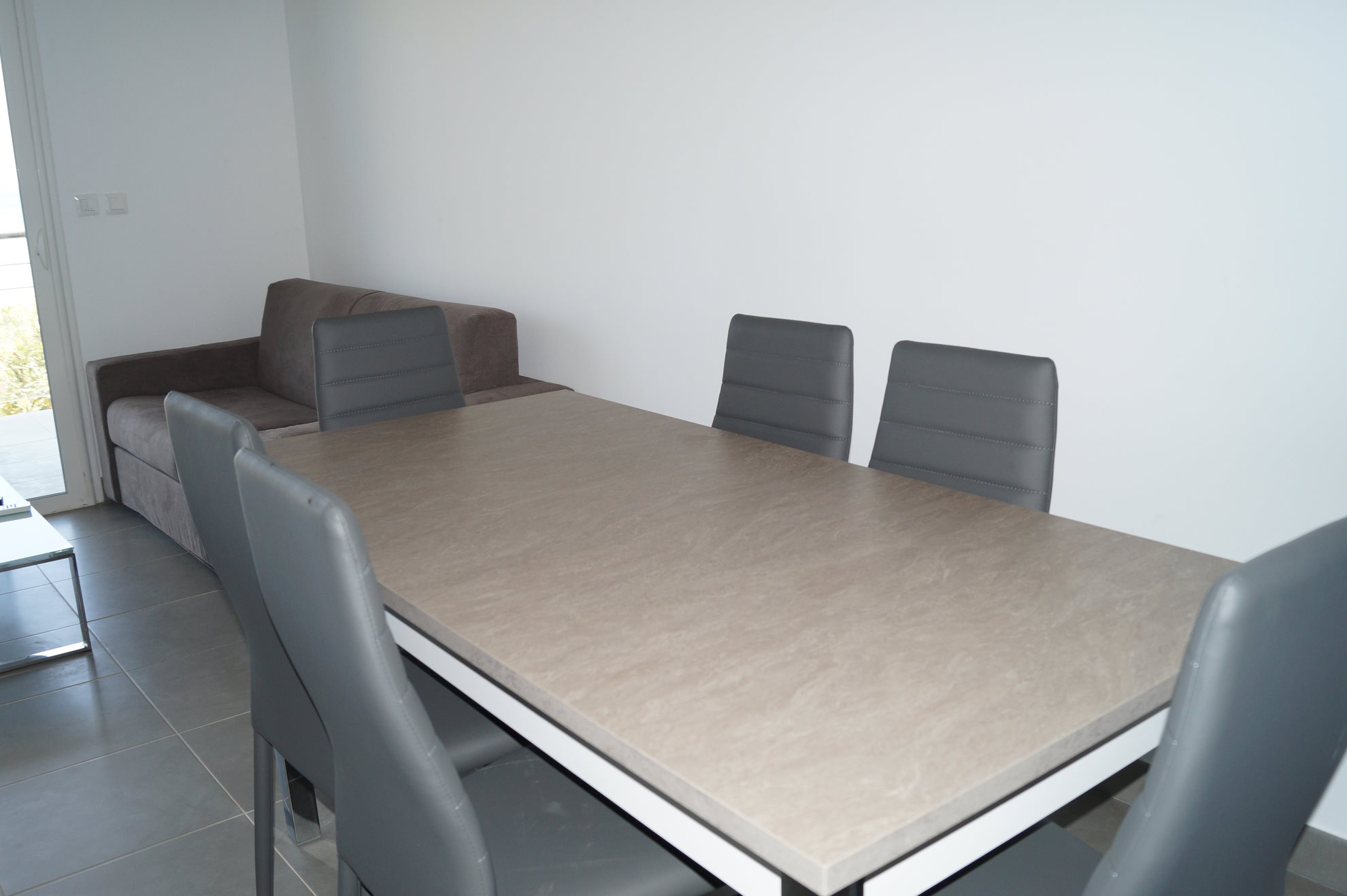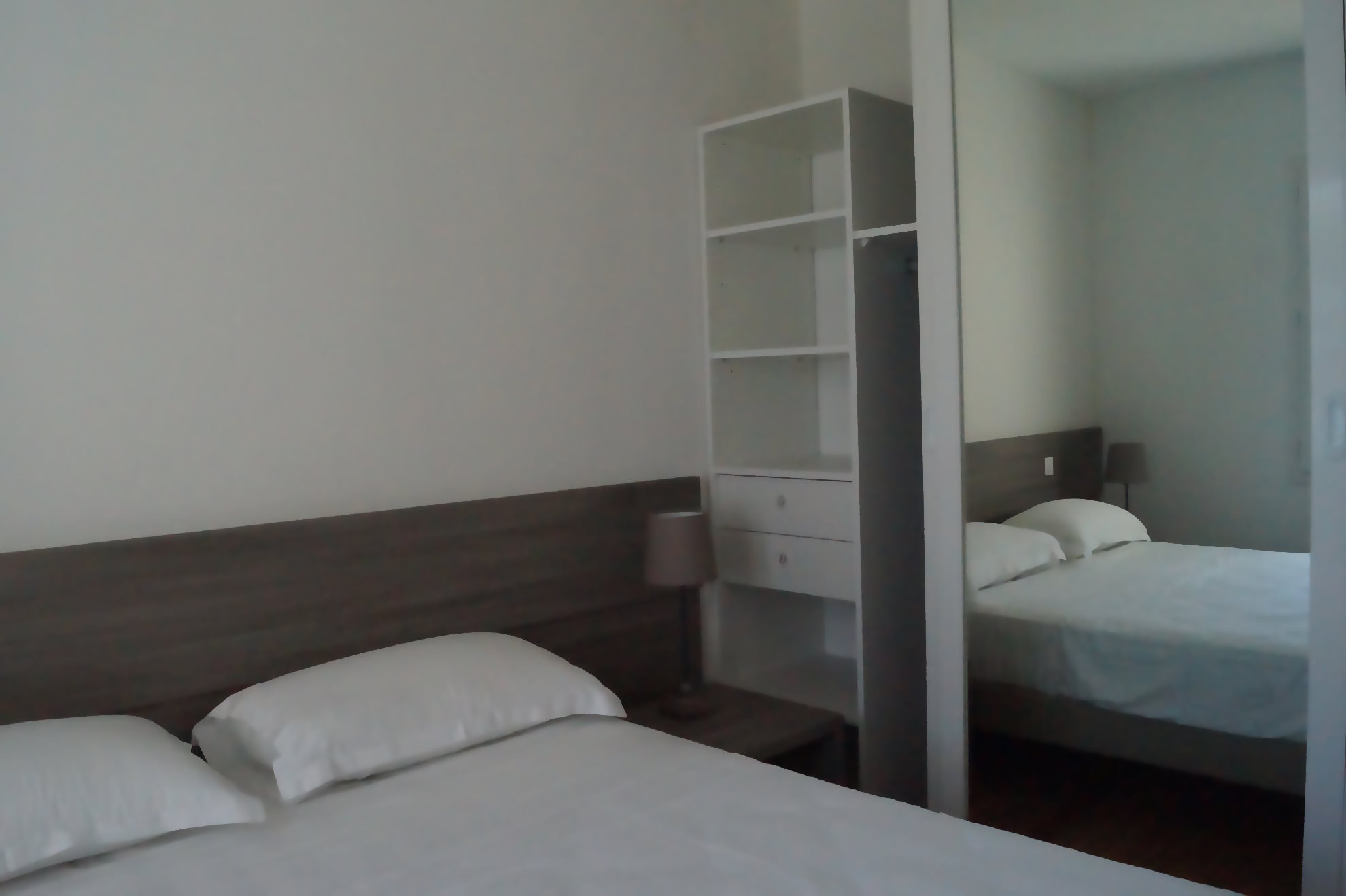 • une pièce principale : canapé-lit convertible (160x200cm), cuisine équipée, table, chaises, télévision, climatisation réversible